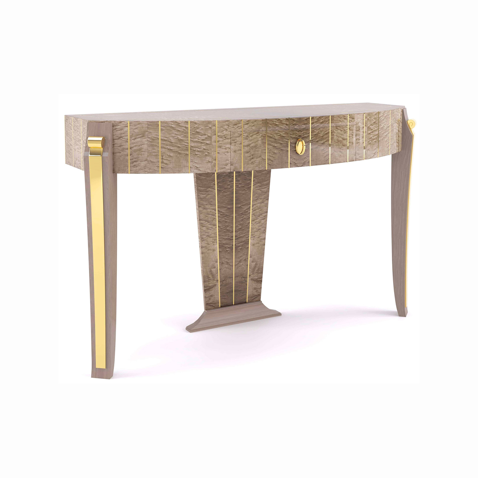Console table veneered in bird's eye maple sand color, brass, metal elements