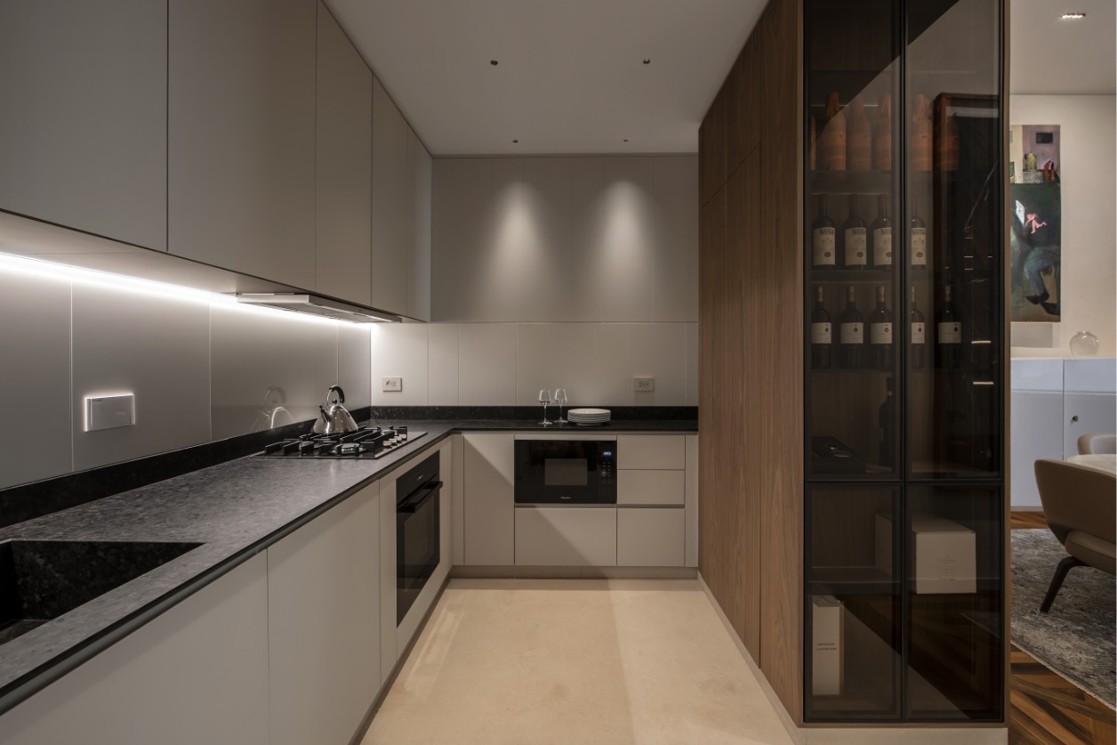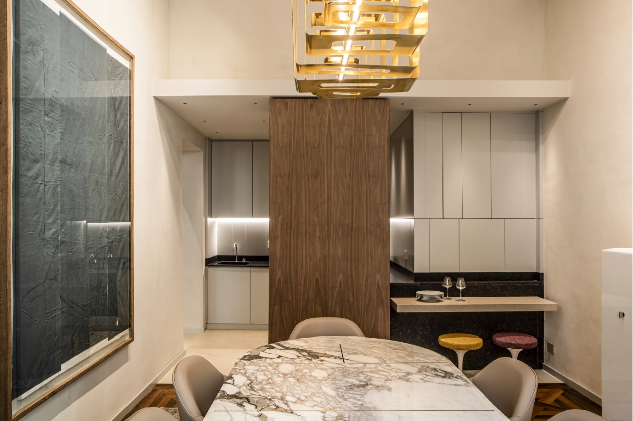 Across all spaces, walnut wood acts as a unifying material language. From the full-height cabinetry in the kitchen to the refined details of the bathroom vanity, this warm essence defines a sense of continuity and visual coherence, creating a sophisticated counterpoint to the neutral tones of the walls and the dramatic marble surfaces.