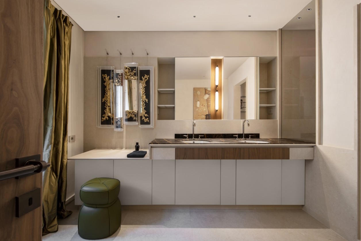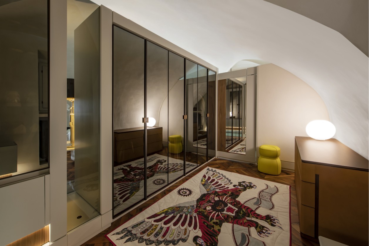 In the private quarters, the design elevates the everyday experience through sensory details. The walk-in closets, nestled under historic vaults, feature reflective surfaces and illuminated interiors that reveal themselves only upon activation. Enriched by leather-clad dressers, artisanal rugs, and finely crafted finishes, these spaces transform storage into an immersive gallery of private luxury.