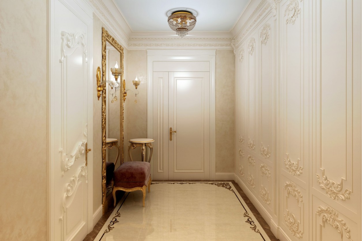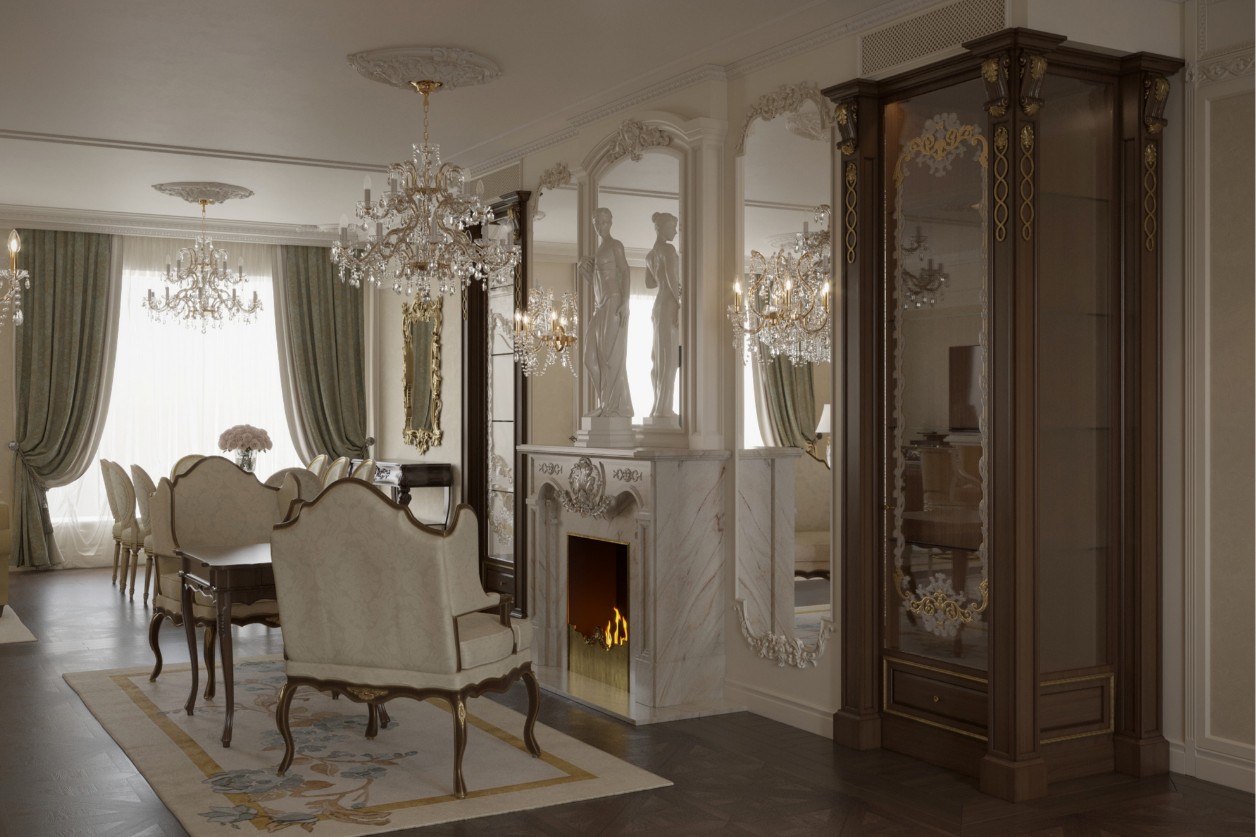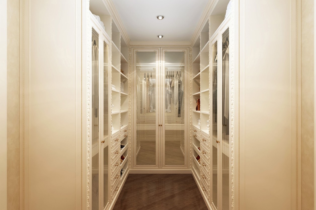 The interior experience is amplified by a curated selection of crystal chandeliers and strategically placed mirrors that double the visual depth of the rooms. The walk-in closets, featuring glass-fronted doors with ornate frames, transform personal storage into a boutique-like gallery. The result is a coherent classical interior where ornament is never excess, but rather precision shaped into timeless elegance.