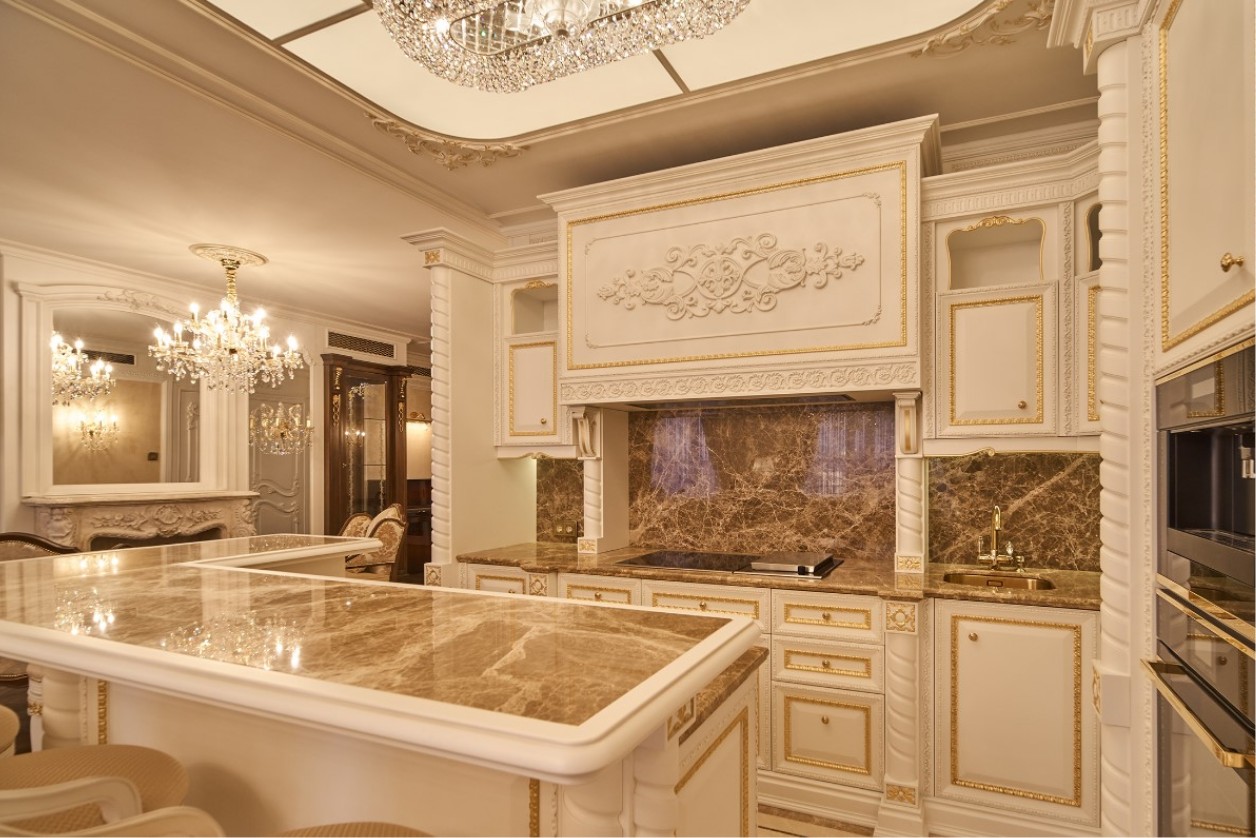 Intricate hand-carved details and gilded filigree run throughout the project, expressing a rich decorative language. This complexity is expertly balanced by a refined plaster-white finish and the generous use of Emperador marble, which adds weight and nobility to the compositions. From the twisted columns of the kitchen island to the delicate bas-reliefs on the wall panels, every surface is a testament to the precision of high-end cabinetry.