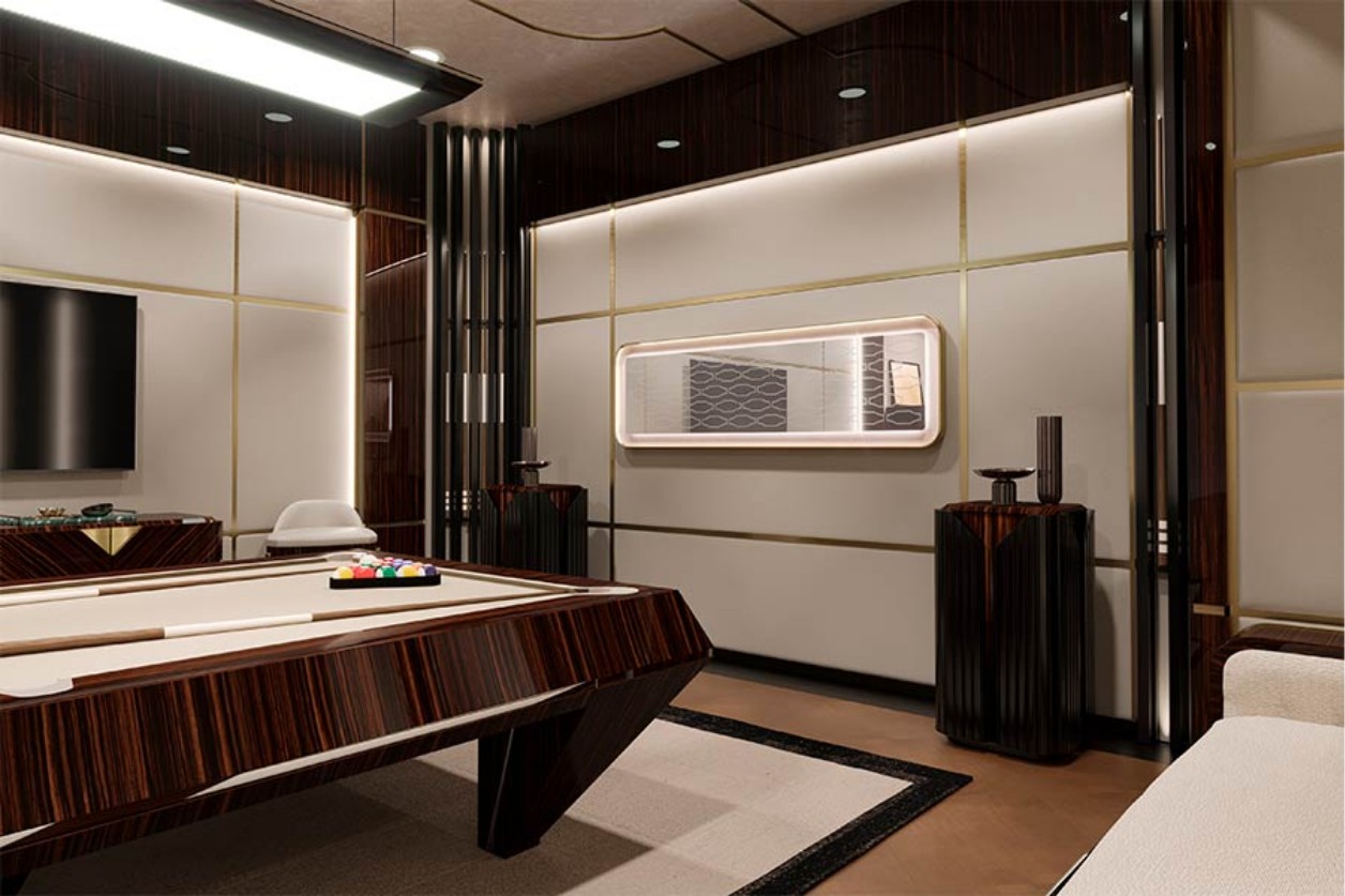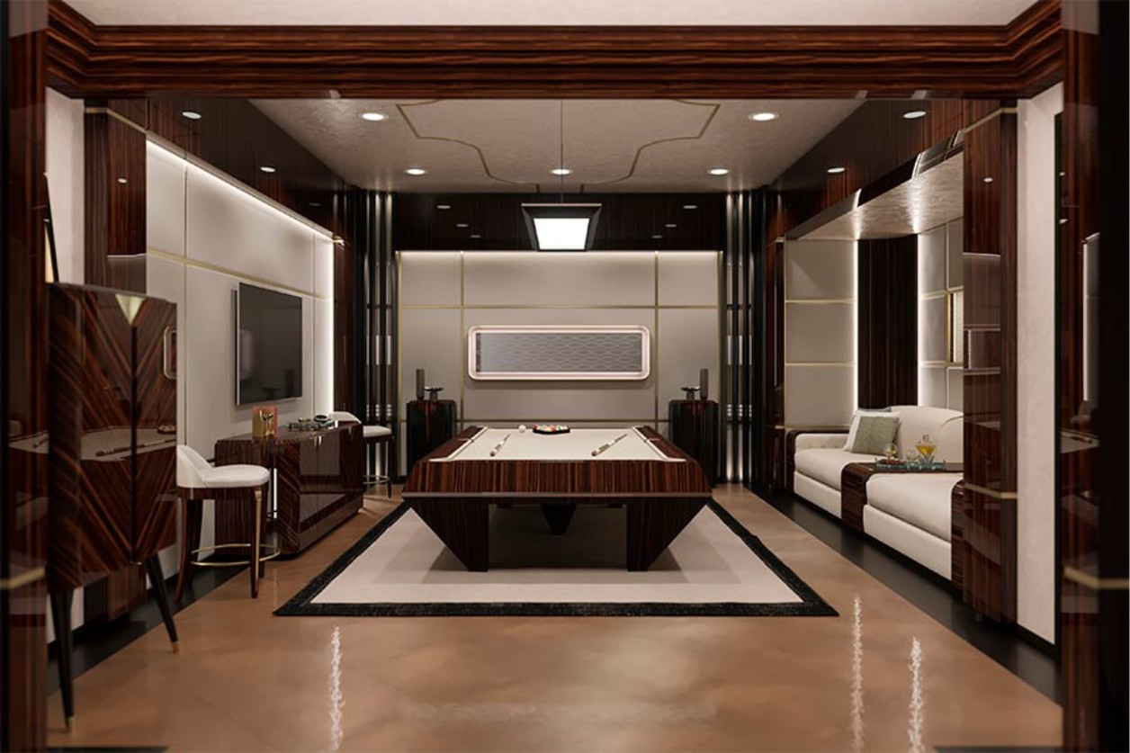 The walls are articulated with ebony-clad pilasters and cream leather panels, creating a sophisticated geometric rhythm. This modular approach is enhanced by custom wall lighting and back-lit mirrors that add depth to the space. Every architectural element, including the integrated media consoles and the stepped moldings of the ceiling, is designed to guide the eye toward the center of the action.