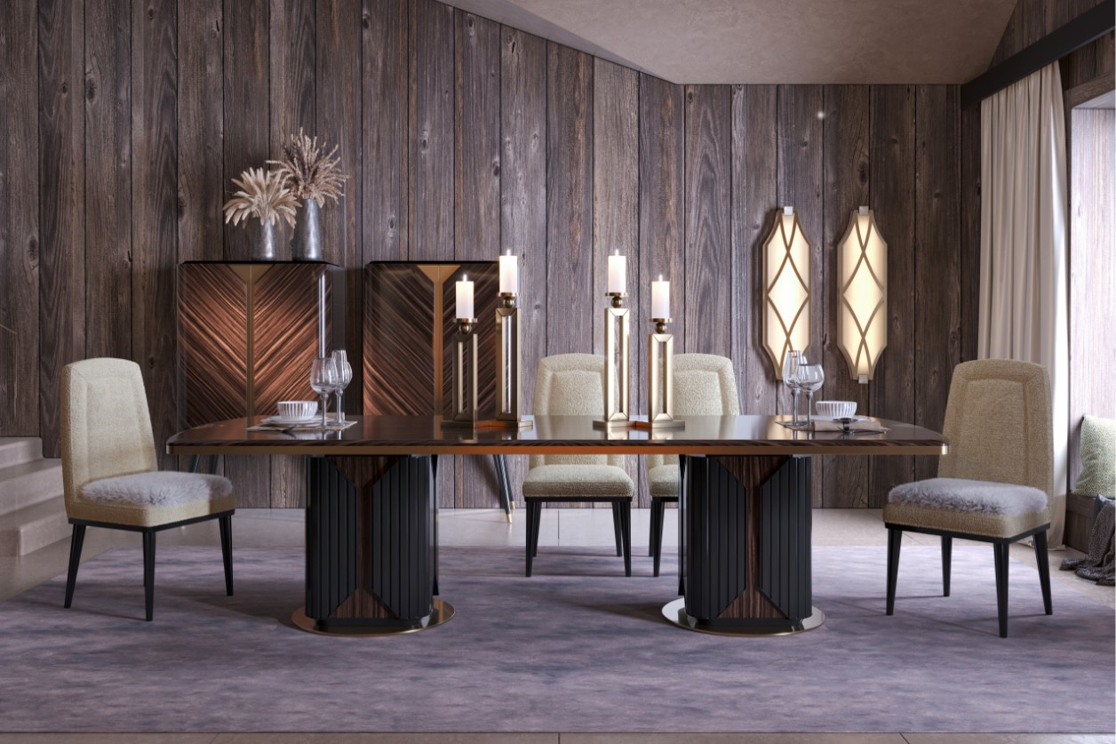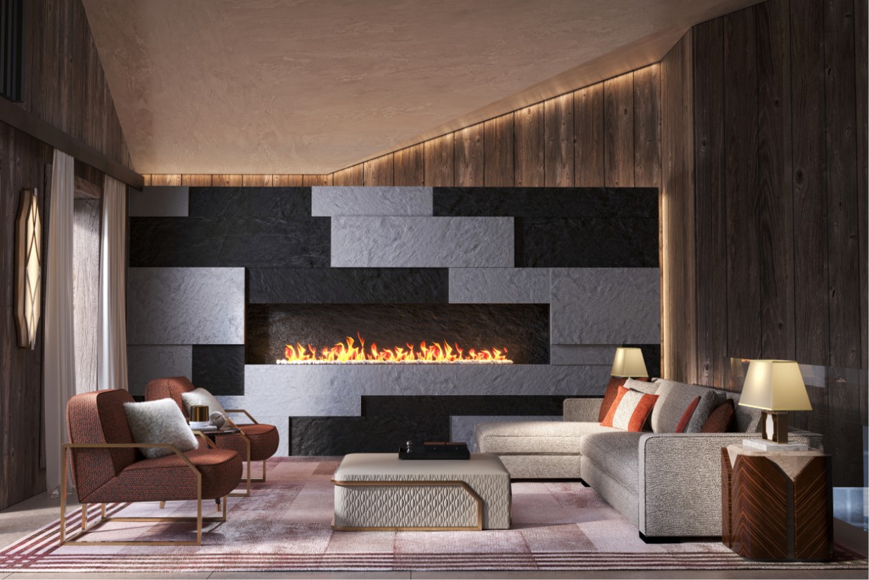 The social spaces are defined by a natural interaction between contemporary forms and alpine character. Pieces such as the Dawson table, with its architectural base, the Denice chairs with tactile shearling-style upholstery, and the Brent cabinets featuring sophisticated wood veneers, interact with the shadows and light of the mountain setting. The result is an environment that feels both expansive and deeply protective.