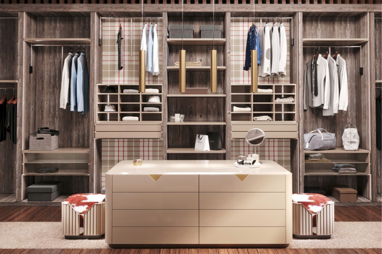 The master suite and private areas continue this dialogue through custom solutions. The bed, with its high, vertically channeled headboard, acts as a soft counterpoint to the stone-cladded walls. Similarly, the walk-in closet is fully adapted to the mountain architecture, enriched with tartan-patterned backdrops and decorative elements that pay homage to traditional alpine residences through a contemporary lens.