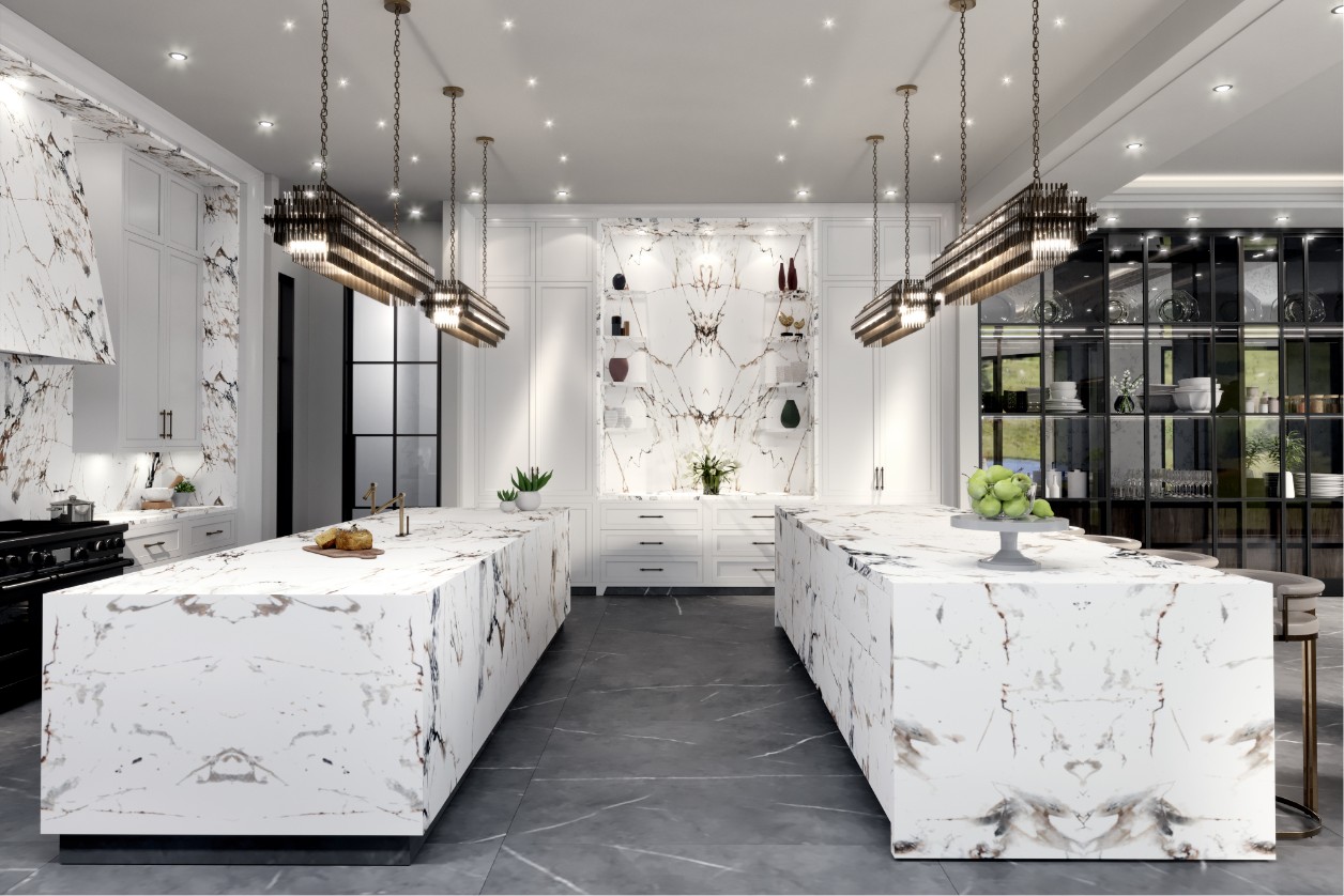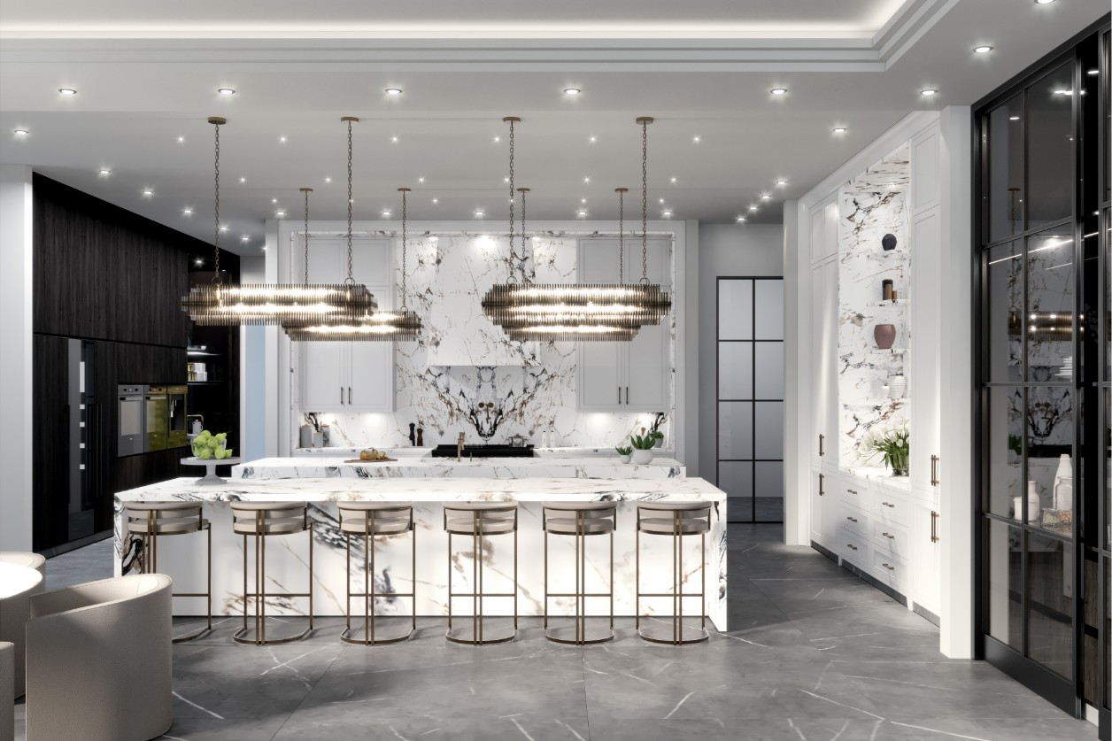 The heart of the home is defined by two monumental twin islands in white marble with dramatic dark veining. This fluid operational core not only organizes the workflow but also acts as a bridge toward the dining area. Above them, custom linear chandeliers reinforce the symmetry, transforming the act of food preparation into a domestic ritual.