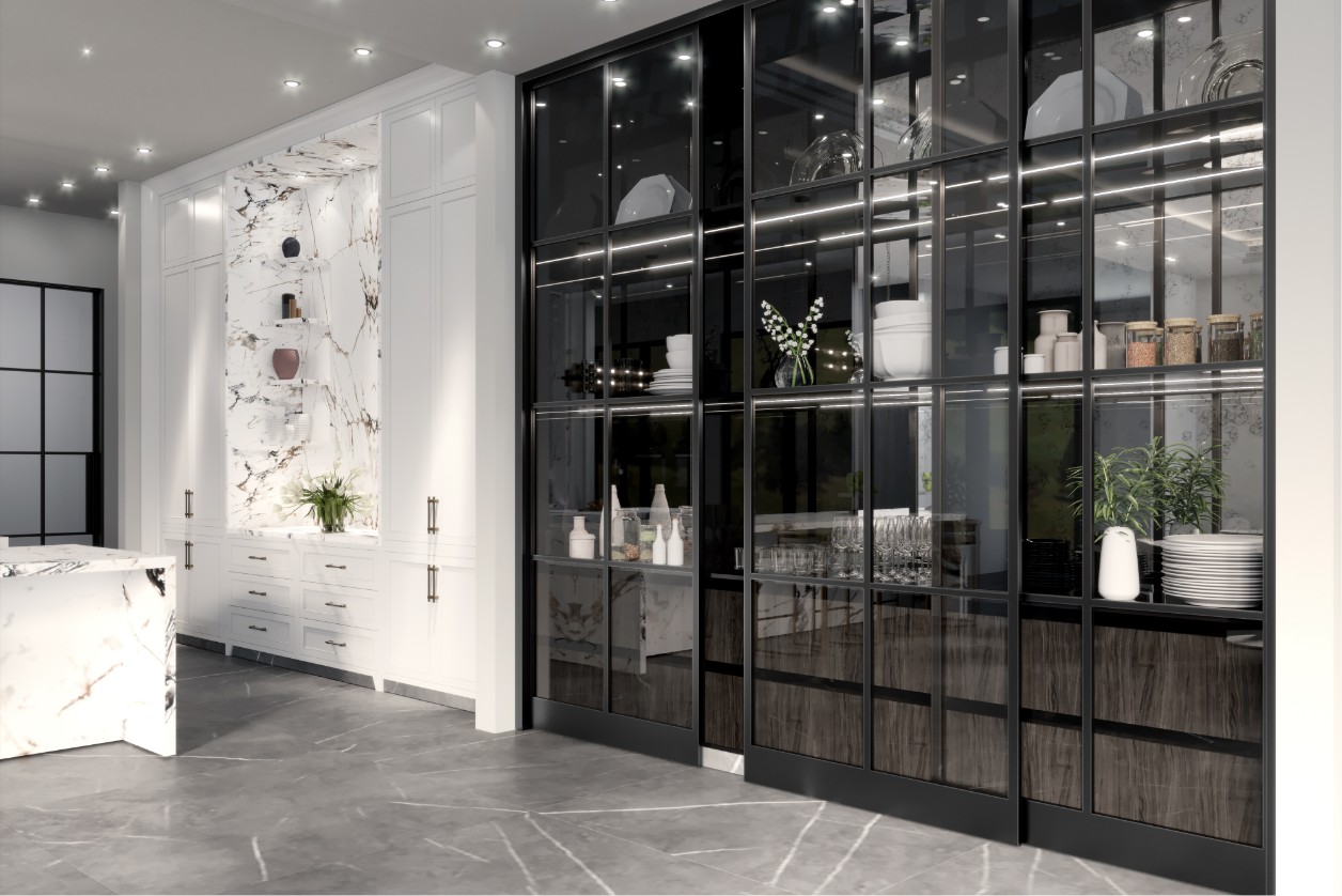 For this residence in Cleveland, the interior design is conceived as a complete architectural system. The project encompasses the main kitchen, a secondary service kitchen, and the mudroom, all unified by a rigorous approach to space and proportion. The main kitchen unfolds as a structured composition where every element is positioned to facilitate both functional use and visual grandeur.