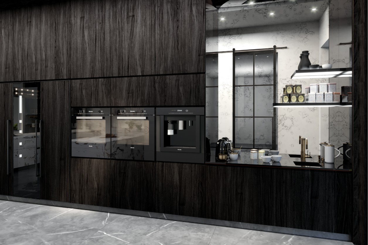 The aesthetic is built on a deliberate visual tension. A wall of floor-to-ceiling dark wood cabinetry, housing integrated high-end appliances and a dedicated coffee station, provides a deep, textured backdrop. This is juxtaposed against the pure, almost clinical white finish of the recessed shelving units and the luminous marble surfaces, creating a sophisticated balance between warmth and minimalism.