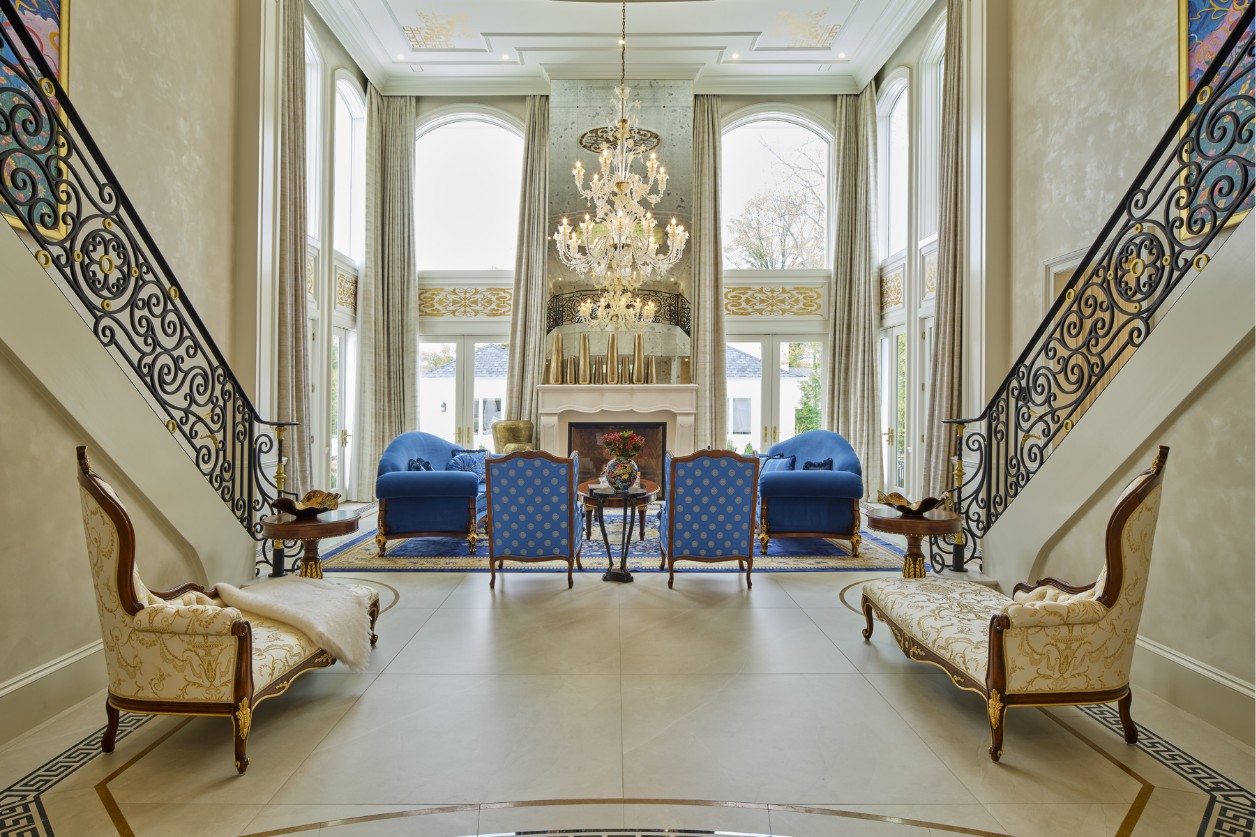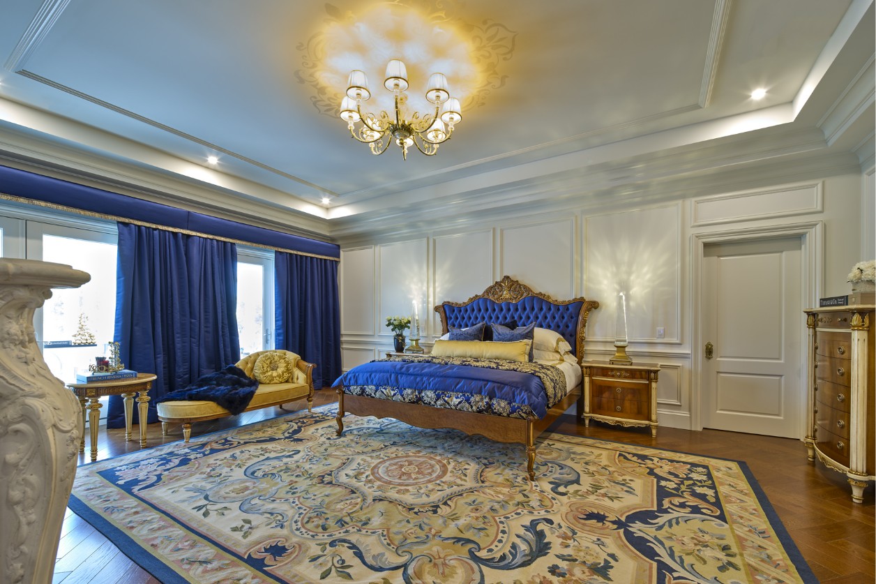 A distinctive feature of the primary living areas and the master suite is the bold use of royal blue. From the plush velvet sofas in the foyer to the intricate upholstery of the master bed, this vibrant hue acts as a unifying thread. It provides a regal contrast to the cream-colored walls and the golden leaf finishes that adorn the furniture, creating a balanced interior where tradition and character coexist.