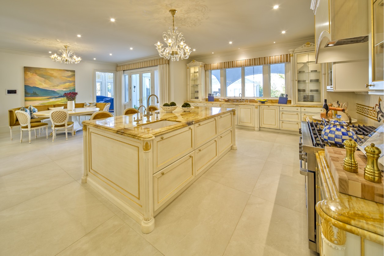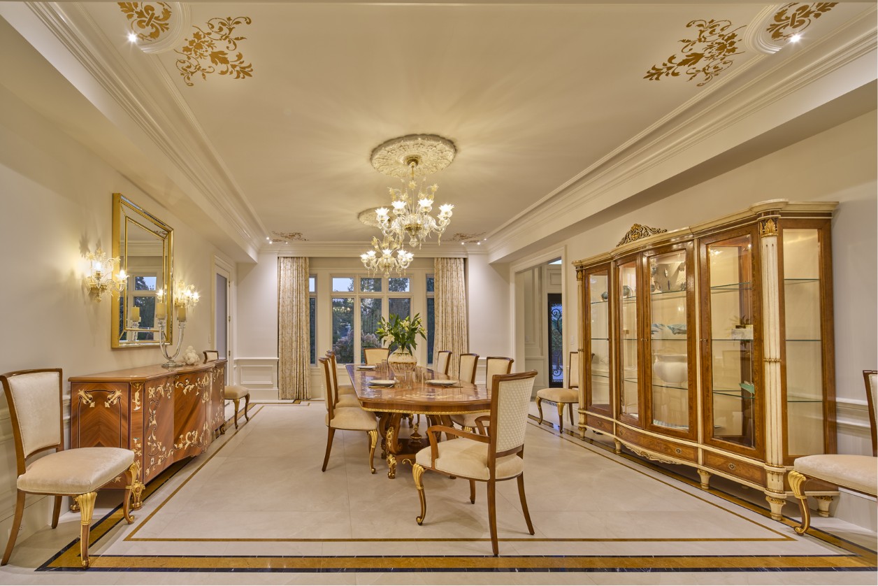 Key spaces such as the professional-grade kitchen with its breakfast nook and the formal dining room have been furnished with pieces from our collections, meticulously adapted in size and finish. The kitchen, featuring a monumental marble island, serves as the informal heart of the home, while the dining room, defined by a long inlaid table and majestic glass cabinets, is designed for ceremonial hospitality.