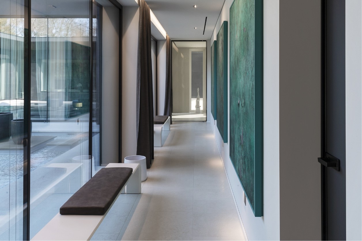 Every transition through the house is an experience: long corridors are transformed into private galleries with textured artworks, while the bedrooms become intimate sanctuaries where geometric patterns and integrated cove lighting enhance the feeling of sophisticated relaxation.