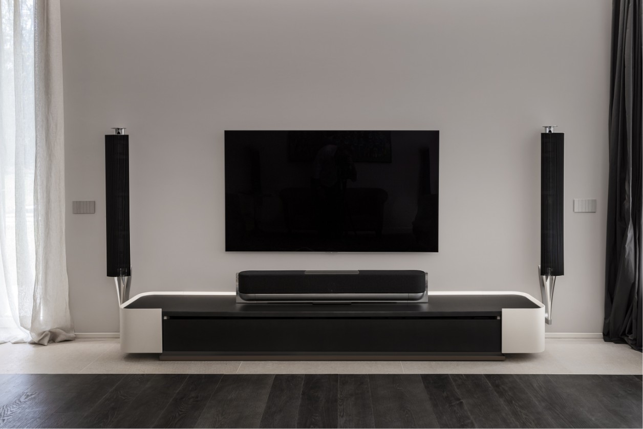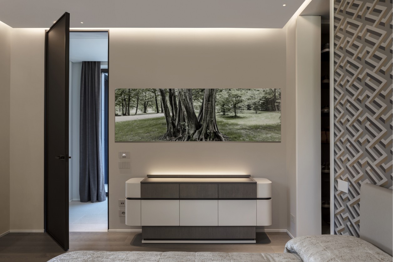 The project is defined by fully bespoke furniture, developed to measure in form, material, and proportion. From the sculptural vanity in the bathroom to the integrated media consoles, every element ensures total architectural coherence. This “tailor-made” approach allows the technical components, such as high-end audio systems and automated lighting, to integrate flawlessly into the design.