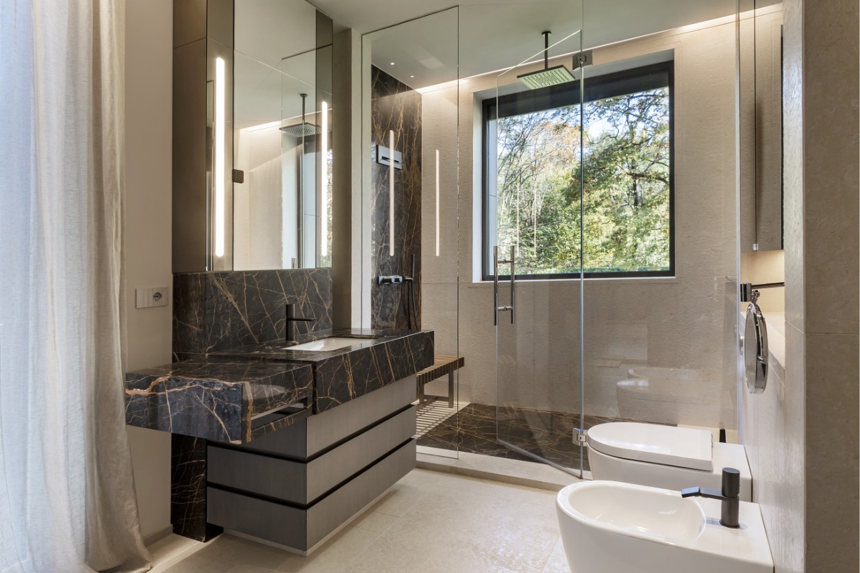 A recurring language of soft, rounded volumes brings continuity to the spaces, reinforcing a sense of calm and visual harmony. The selection of refined materials, dark veined marble, tactile fabrics, and warm woods, echoes the organic tones of the woods outside.