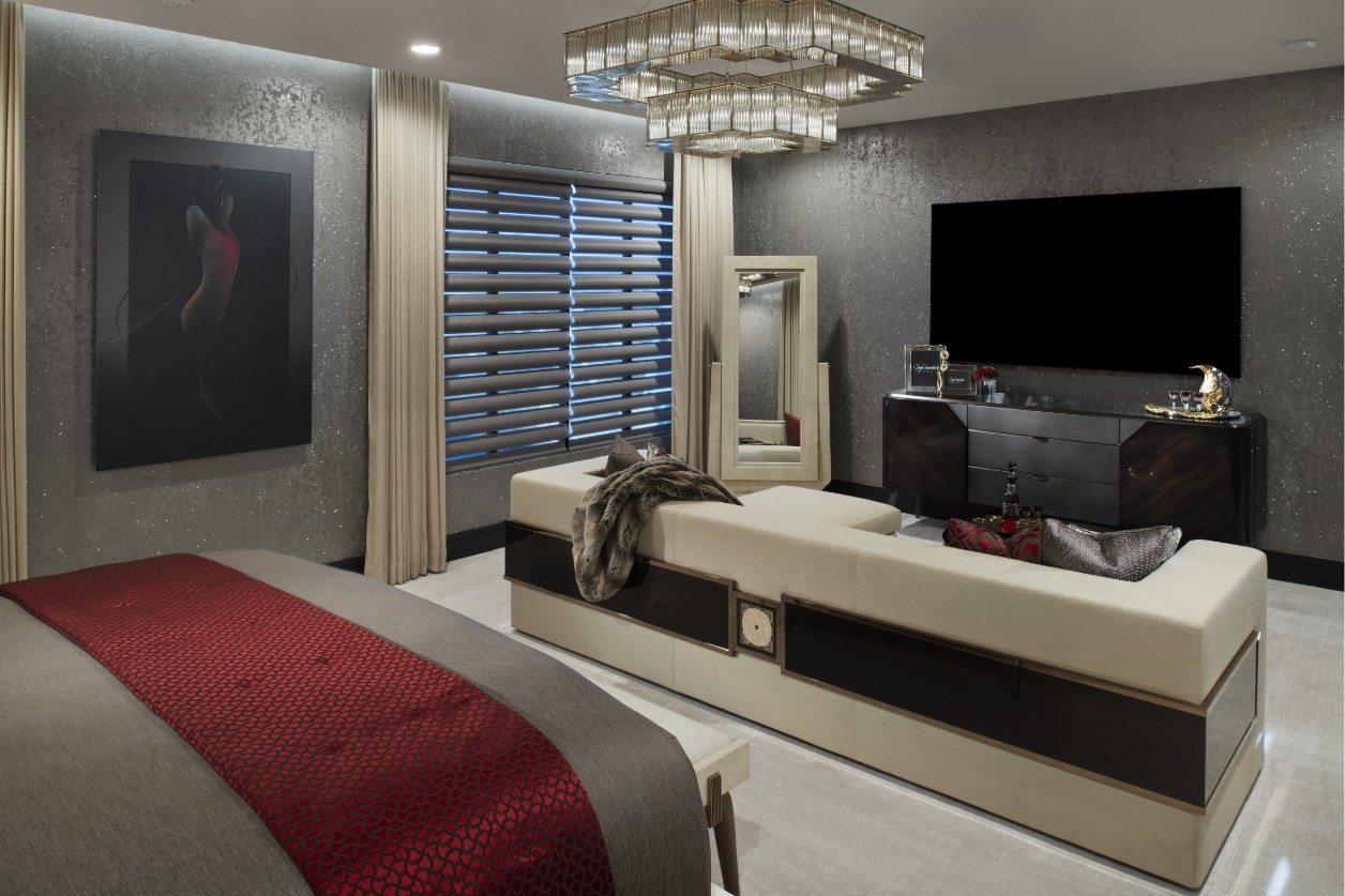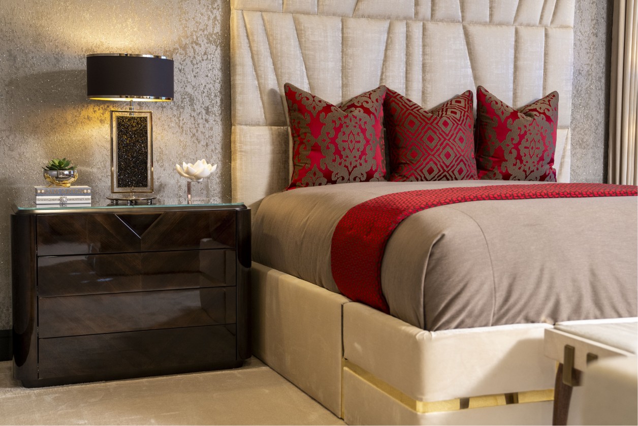 The project is defined by a rich tactile palette. Shimmering wall coverings provide a dramatic backdrop for the neutral tones of the velvet upholstery, while bold crimson accents and faux-fur throws add warmth and character. Every detail, from the geometric stitching of the headboard to the crystal facets of the tiered chandelier, is a testament to decorative precision