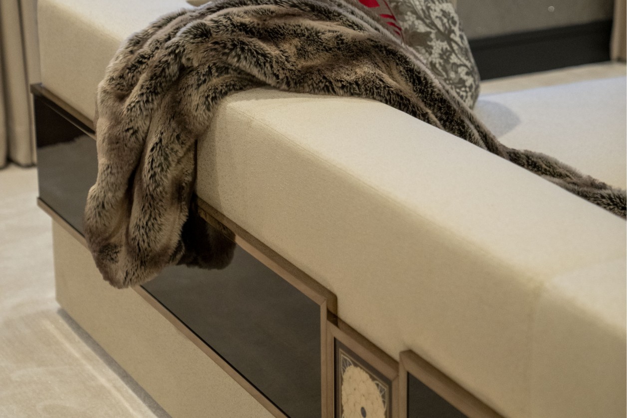 For the master suite, we developed a complete set of bespoke furniture, including an architectural headboard, bedside tables, a dresser, and a sculptural sofa with an integrated coffee table. Each element was customized according to the client’s lifestyle, featuring high-gloss finishes, dark wood veneers, and metallic accents that catch the light, ensuring a coherent and prestigious atmosphere.